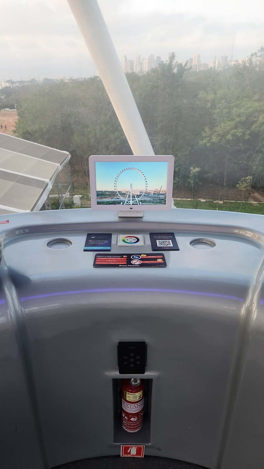O monitor nos orienta sobre o sistema de som e luzes da cabine, o monitor interativo e o interfone de segurança, caso alguém passe mal no trajeto. Para sua tranquilidade, todas as cabines são monitoradas. A visão é panorâmica e oito pessoas se acomodam tranquilamente em seu espaço. A volta completa dura cerca de 25 minutos, e a maior alegria é quando sua cabine está lá no alto, sendo a mais alta de todas!