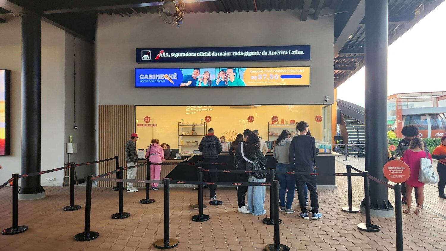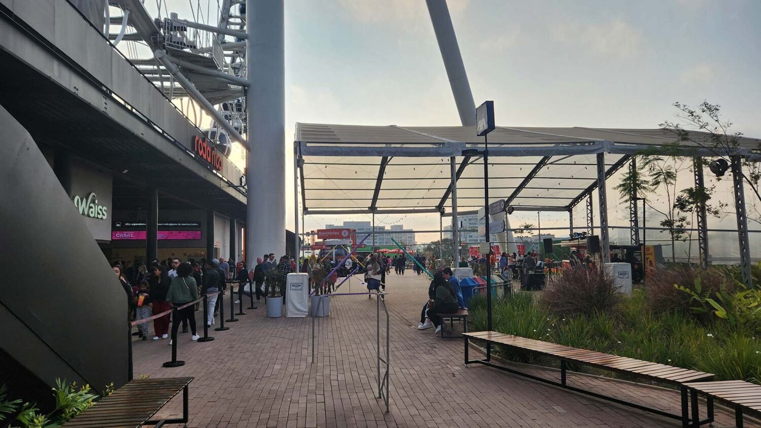 Por ser uma roda gigante de 91 metros, o ponto de embarque é, claro, no alto. Então, após a leitura dos ingressos, você receberá uma senha e subirá um escadão. Ao chegar nesse mezanino, você encontrará mesas, bancos e itens à venda para consumo, como bebidas e salgados. Sim, você pode levar esses itens para dentro da cabine da roda-gigante, já que até mesinhas são disponibilizadas para o seu conforto.