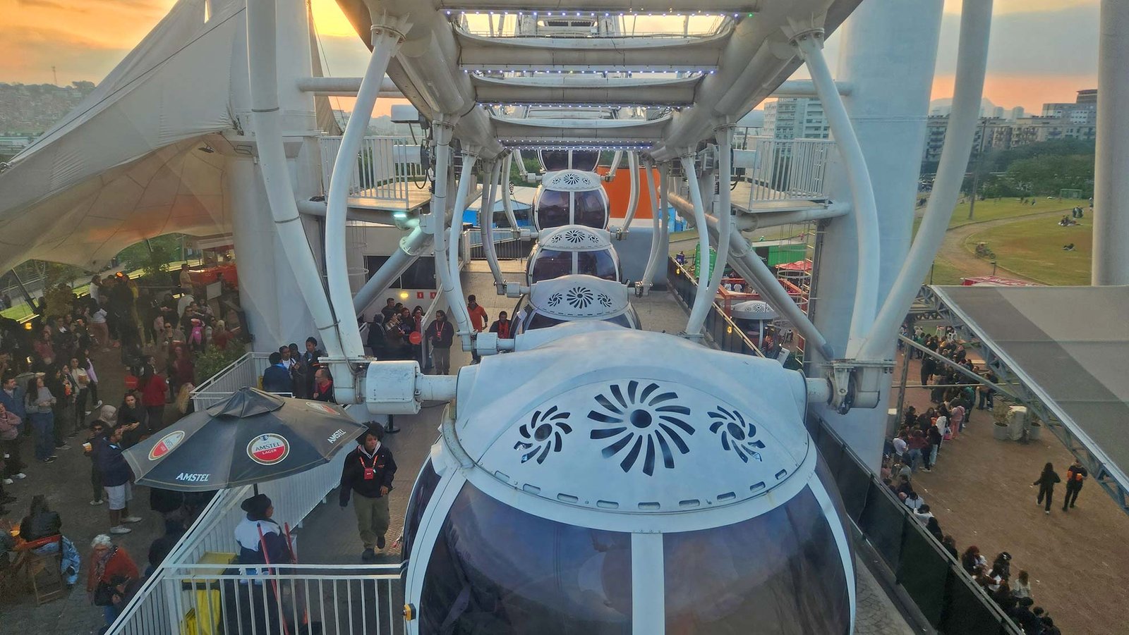 Por ser uma roda gigante de 91 metros, o ponto de embarque é, claro, no alto. Então, após a leitura dos ingressos, você receberá uma senha e subirá um escadão. Ao chegar nesse mezanino, você encontrará mesas, bancos e itens à venda para consumo, como bebidas e salgados. Sim, você pode levar esses itens para dentro da cabine da roda-gigante, já que até mesinhas são disponibilizadas para o seu conforto.